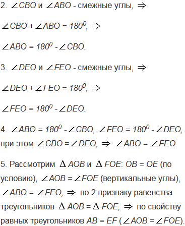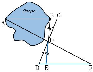 На рисунке 101 ОС = OD, ОВ = ОЕ. Докажите, что АВ = ЕF. Объясните способ измерения ширины озера (отрезка АВ на рисунке 101), основанный на этой задаче.