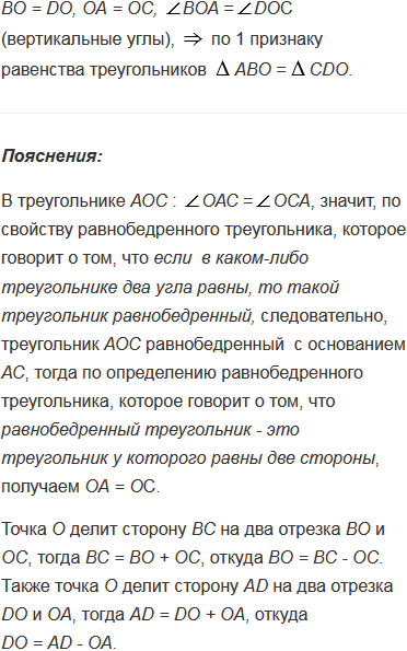 В треугольниках АВС и АDС стороны ВС и АD равны и пересекаются в точке О, ОАС =ОСА. Докажите, что треугольники АВО и СDО равны.