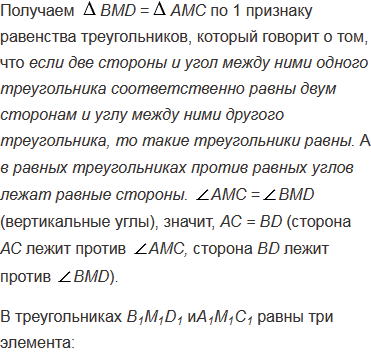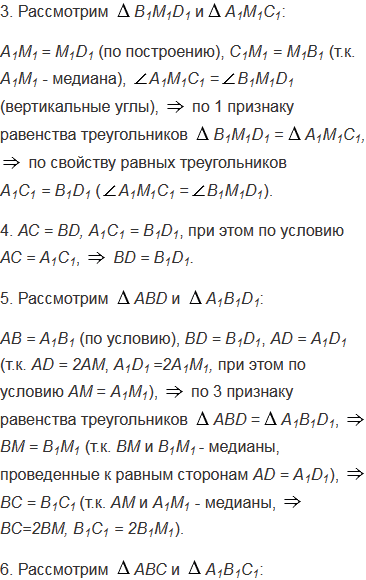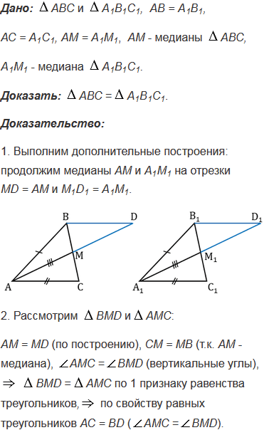 Докажите, что треугольники АВС и А1В1С1 равны, если АВ = А1В1, АС = А1С1, АМ = А1М1, где АМ и А1М1 - медианы треугольников.