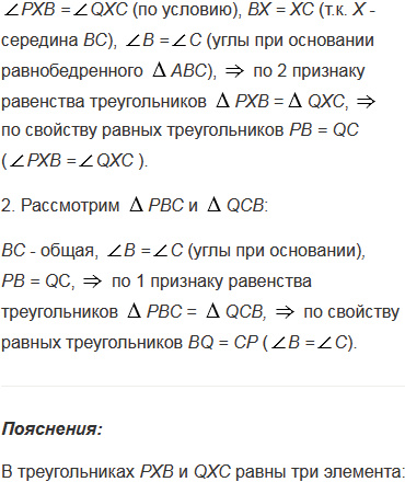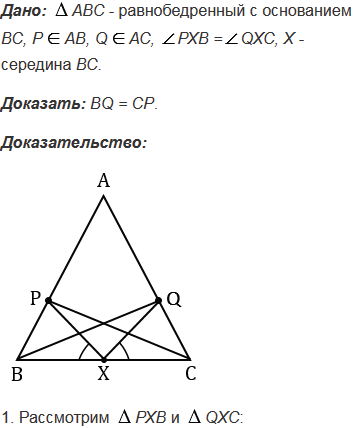 На боковых сторонах АВ и АС равнобедренного треугольника АВС отмечены точки Р и Q так, что РХВ =QХС, где Х - середина основания ВС. Докажите, что ВQ = СР.
