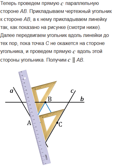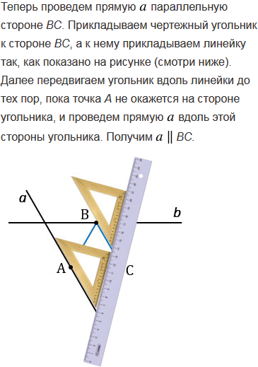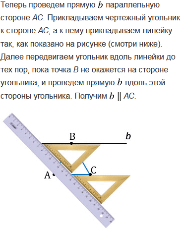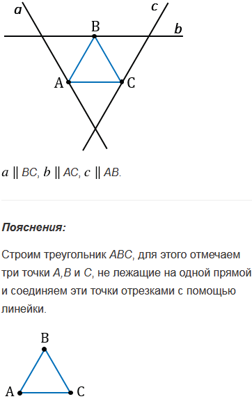 Начертите треугольник. Через каждую вершину этого треугольника с помощью чертежного угольника и линейки проведите прямую, параллельную противоположной стороне.