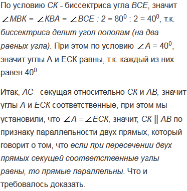 В треугольнике АВС угол А равен 400, а угол ВСЕ, смежный с углом АСВ, равен 800. Докажите, что биссектриса угла ВСЕ параллельна прямой АВ.