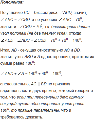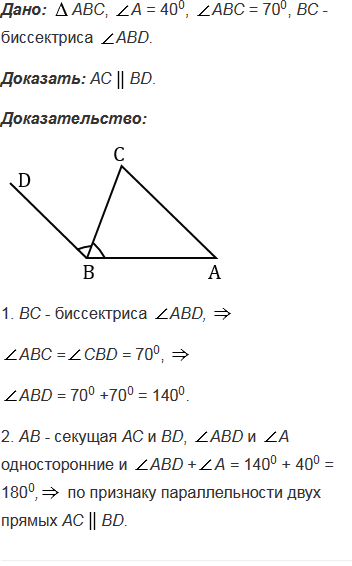 В треугольнике АВС А = 400, В = 700. Через вершину В проведена прямая ВD так, что луч ВС - биссектриса угла АВD. Докажите, что прямые АС и ВD параллельны.