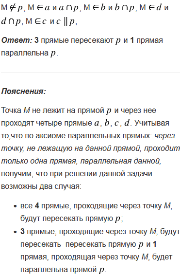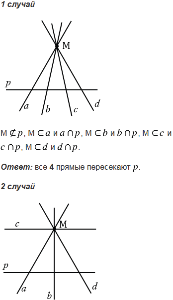 Через точку, не лежащую на прямой р, проведены четыре прямые. Сколько из этих прямых пересекает прямую р? Рассмотрите все возможные случаи.