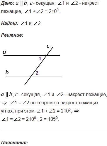 Сумма накрест лежащих углов при пересечении двух параллельных прямых секущей равна 2100. Найдите эти углы.