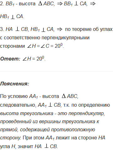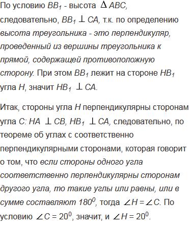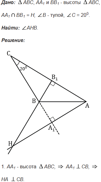 Прямые, содержащие высоты АА1 и ВВ1 треугольника АВС, пересекаются в точке Н, угол В - тупой, С = 200. Найдите угол АНВ.