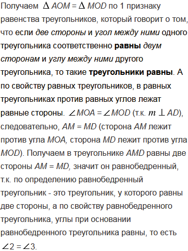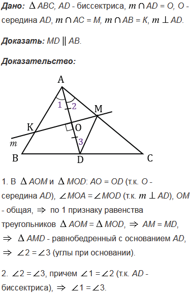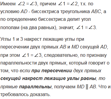 Прямая, проходящая через середину биссектрисы АD треугольника АВС и перпендикулярная к АD, пересекает сторону АС в точке М. Докажите, что МDАВ.