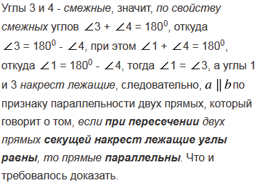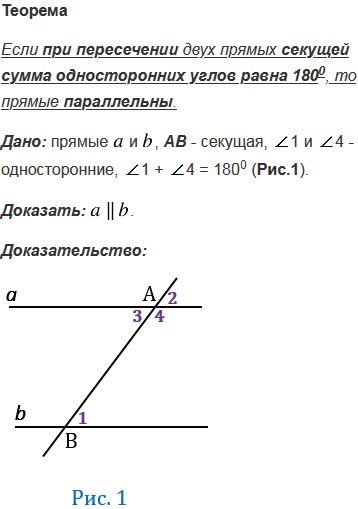 Докажите, что если при пересечении двух прямых секущей сумма односторонних углов равна 1800, то прямые параллельны.