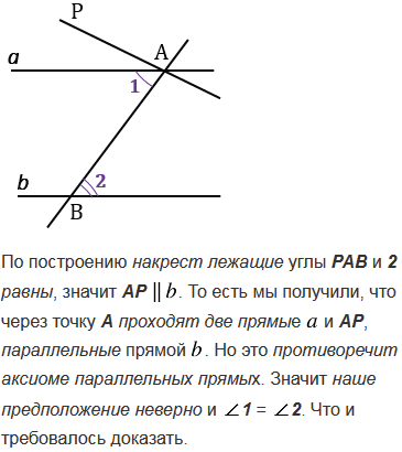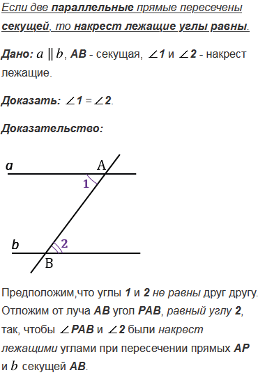 Докажите, что при пересечении двух параллельных прямых секущей накрест лежащие углы равны.