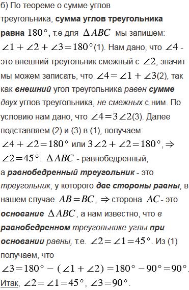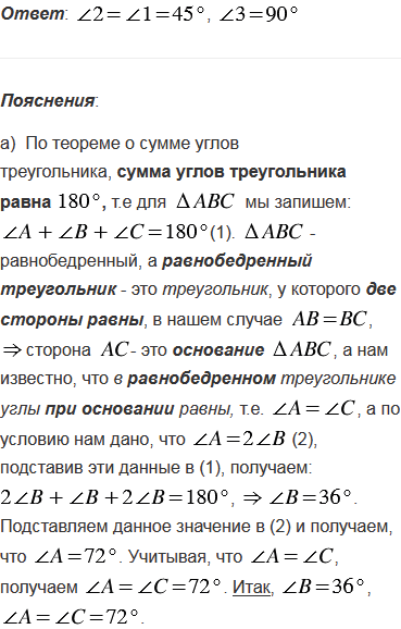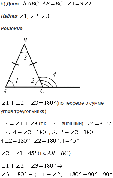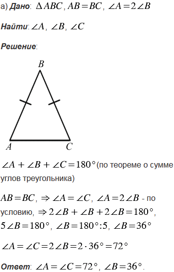 Найдите углы равнобедренного треугольника, если: а) угол при основании в два раза больше угла, противолежащего основанию; б) угол при основании в три раза меньше внешнего угла, смежного с ним.