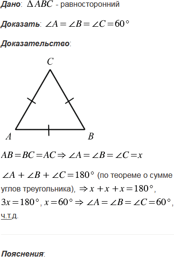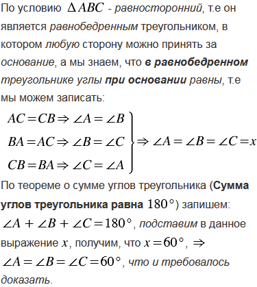 Докажите, что каждый угол равностороннего треугольника равен 60
