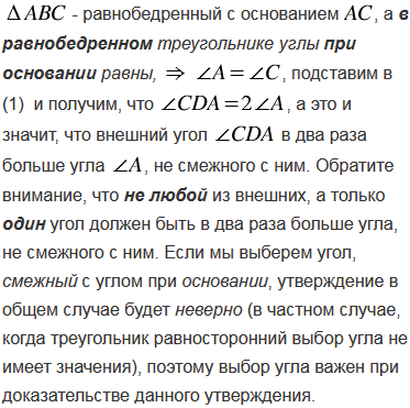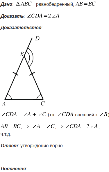 Верно ли утверждение: если треугольник равнобедренный, то один из его внешних углов в 2 раза больше угла треугольника, не смежного с этим внешним углом?