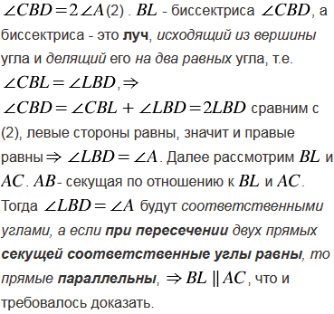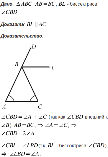 Докажите, что биссектриса внешнего угла при вершине равнобедренного треугольника, противолежащей основанию, параллельна основанию.