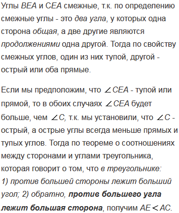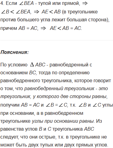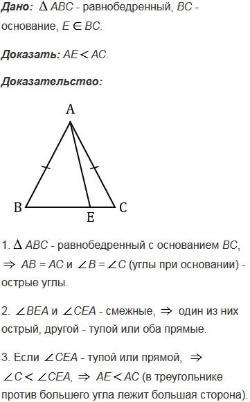 Докажите, что в равнобедренном треугольнике отрезок, соединяющий любую точку основания, отличную от вершины, с противоположной вершиной, меньше боковой стороны.