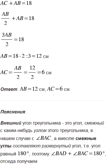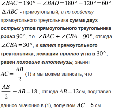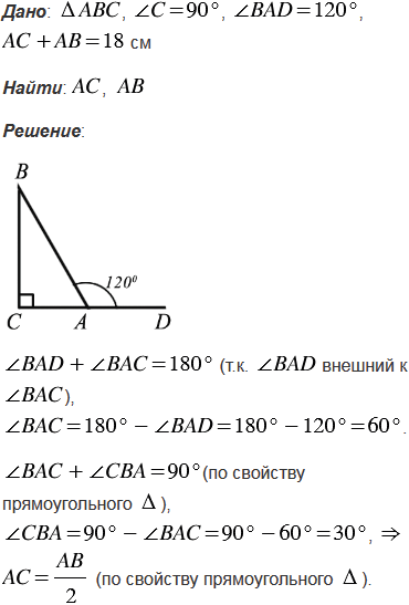В прямоугольном треугольнике ABC с прямым углом C внешний угол при вершине A равен 1200, AC + AB = 18 см. Найдите AC и AB.