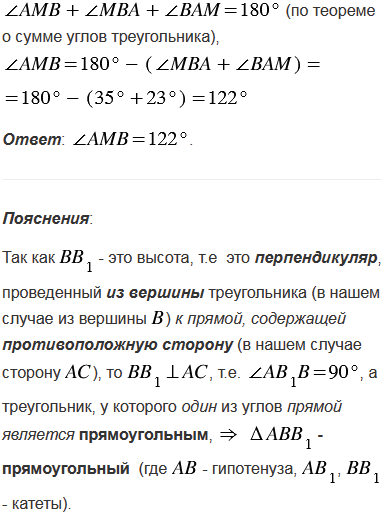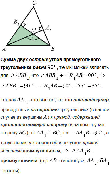 Высоты АА1 и ВВ1 треугольника АВС пересекаются в точке М. Найдите АМВ, если А = 550, В = 670.