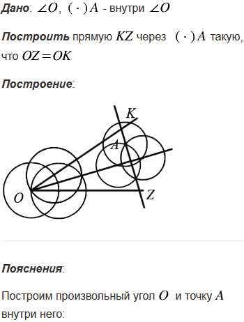 Внутри угла дана точка А. Постройте прямую, проходящую через точку А и отсекающую на сторонах угла равные отрезки.