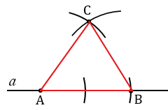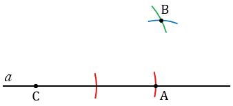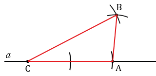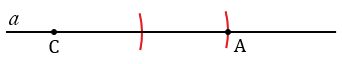 а) С помощью линейки проводим прямую и на ней с помощью циркуля отложим отрезок СА = 2Р3Q3. Для этого произвольно на прямой ставим точку С, с помощью циркуля измеряем отрезок Р3Q3 и строим окружность с центром в точке С радиуса Р3Q3, переставляем острие циркуля в точку пересечения полученной окружности с прямой и еще раз чертим окружность радиуса Р3Q3 (полностью окружности строить необязательно, смотри, выделенное красным цветом). Точку пересечения второй окружности с прямой обозначаем А.