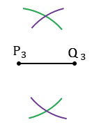 Чтобы построить СА =  Р3Q3 нужно найти середину отрезка Р3Q3. Для этого с помощью циркуля строим две окружности радиуса Р3Q3 с центрами в точках Р3 и Q3 (полностью окружности строить необязательно, смотри, выделенное зеленым и фиолетовым цветом).