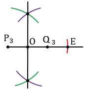Получим две точки пересечения данных окружностей, через них с помощью линейки проводим прямую, которая пересечет отрезок Р3Q3 в центре - точке О. Затем измеряем отрезок Р3О и откладываем его от точки Q3 на продолжении луча Р3Q3. Для этого с помощью линейки продолжаем луч Р3Q3 и строим окружность с центром в точке Q3 радиуса Р3О (полностью окружность строить необязательно, смотри, выделенное красным цветом). Точку пересечения данной окружности с лучом Р3Q3 обозначаем E.