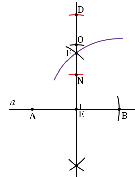 . На лучах, исходящих из точки О, с помощью циркуля откладываем равные отрезки ЕN и ED. Для этого строим окружность с центром в точке Е, при этом всю окружность строить не обязательно, достаточно сделать пометки по разные стороны от точки Е (смотри выделенное красным).