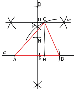 Далее, с помощью линейки проводим луч ВН. Точку пересечения лучей АF и BH обозначаем С.