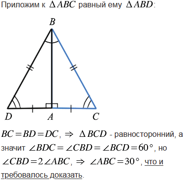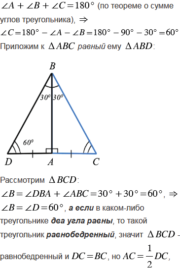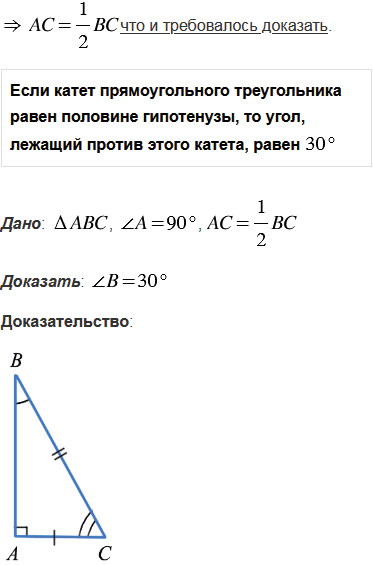 Докажите, что катет прямоугольного треугольника, лежащий против угла в 300, равен половине гипотенузы. Сформулируйте и докажите обратное утверждение.