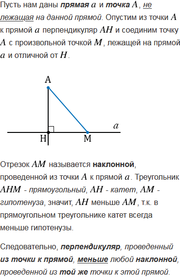 Докажите, что перпендикуляр, проведённый из точки к прямой, меньше любой наклонной, проведённой из той же точки к этой прямой.