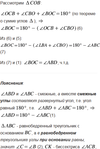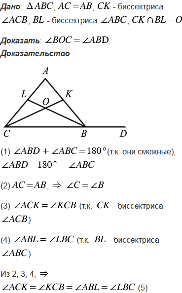 В равнобедренном треугольнике ABC биссектрисы равных углов B  и C пересекаются в точке O. Докажите, что угол BOC равен внешнему углу треугольника при вершине B.