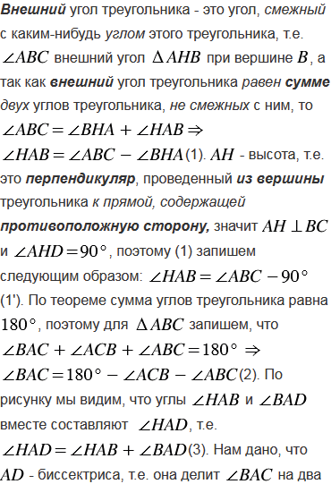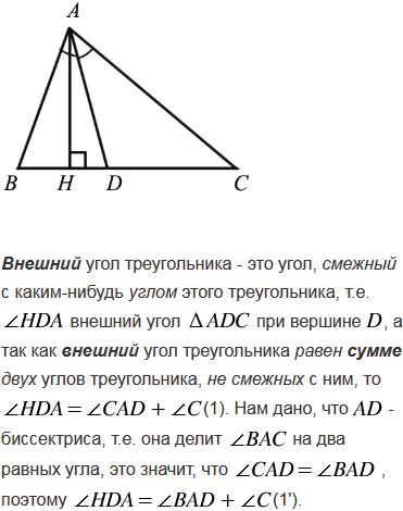 В треугольнике с неравными сторонами AB и AC проведены высота AH и биссектриса AD. Докажите, что угол HAD равен полуразности углов В и С.