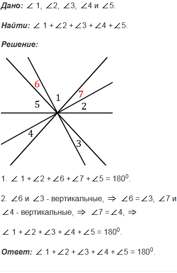 Пять прямых пересекаются в одной точке (рис.147). Найдите сумму углов 1, 2, 3, 4 и 5.