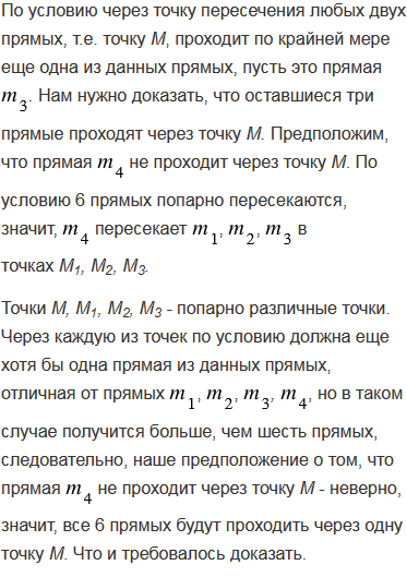 Даны шесть попарно пересекающихся прямых. Известно, что через точку пересечения любых двух прямых проходит по крайней мере еще одна из данных прямых. Докажите, что все эти прямые проходят через одну точку.