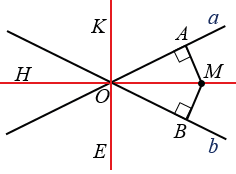 точка М лежит на биссектрисе угла, образованного при пересечении прямых а и b. Аналогично доказывается с остальными углами.Вернуться к содержанию учебника