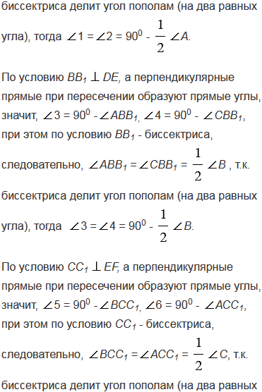 Через каждую вершину данного треугольника проведена прямая, перпендикулярная к биссектрисе треугольника, исходящей из этой вершины. Отрезки этих прямых вместе со сторонами данного треугольника образуют три треугольника. Докажите, что углы этих треугольников соответственно равны.