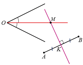 Искомая точка М - точка пересечения биссектрисы данного угла (ОМ) и серединного перпендикуляра к данному отрезку (КМ).