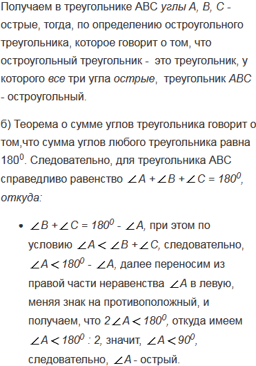 б) каждый угол меньше суммы двух других углов.