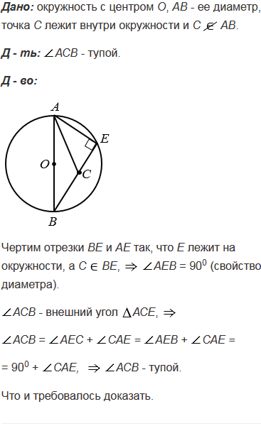 Докажите, что если точка С внутренняя точка относительно окружности, не лежащая на её диаметре АВ, то угол АСВ тупой.