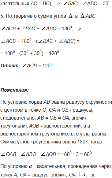 Через концы хорды АВ, равной радиусу окружности, проведены две касательные, пересекающиеся в точке С. Найдите угол АСВ.