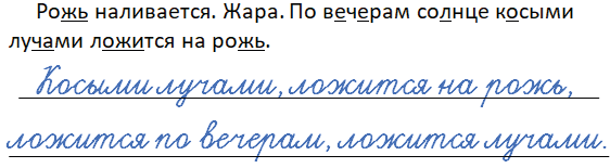 В предложении нам встретились следующие орфограммы: грамматический мягкий знак после шипящих (рожь), безударная гласная в корне (вечерам – вечер), проверяемая непроизносимая согласная в корне слова (солнце – солнечный), ча-ща (лучами), правописание слов с чередованием гласных букв в корне (ложится).