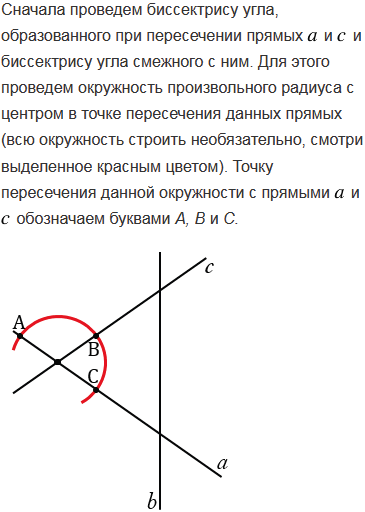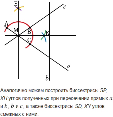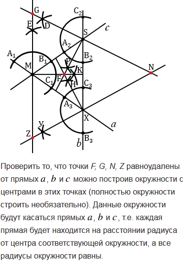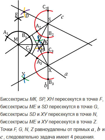 Даны три попарно пересекающиеся прямые, не проходящие через одну точку. Постройте точку, равноудаленную от этих прямых. Сколько решений имеет задача?
