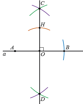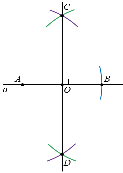 Далее построим середину отрезка АВ - точку О. Для этого строим с помощью циркуля две окружности радиуса АВ с центрами в точках А и В (полностью окружности можно не строить). Получаем две точки пересечения данных окружностей. Обозначим их С и D. Проведем с помощью линейки через точки C и D прямую CD, которая пересечет АВ в точке О - середине отрезка АВ.