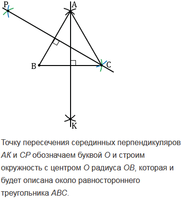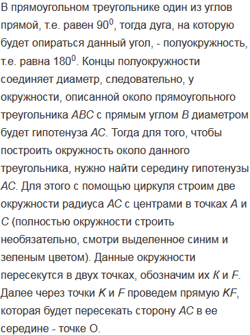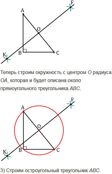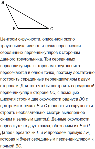 Начертите три треугольника: тупоугольный, прямоугольный и остроугольный. Для каждого из них постройте описанную окружность. Как расположен центр окружности относительно треугольника в каждом случае?