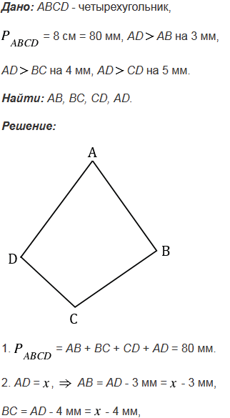 Найдите стороны четырехугольника, если его периметр равен 8 см, а одна сторона больше каждой из других сторон соответственно на 3 мм, 4 мм и 5 мм.