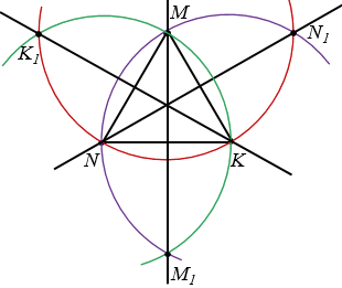 МNK. Чтобы построить оси симметрии этого равностороннего треугольника строим три окружности с центрами в точках М, N и K радиуса NM (полностью окружности строить необязательно). Каждая пара окружностей пересекутся в двух точках М и М1, N и N1, K и K1. Прямые ММ1, NN1 и KK1 - оси симметрии равностороннего
