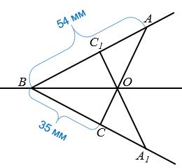 Прямая ВО — ось симметрии угла АВС. Треугольник ВА1С1 симметричен треугольнику АВС относительно прямой ВО. Определите длины отрезков А1С и АС1, если ВА = 5,4 см, ВС = 35 мм.