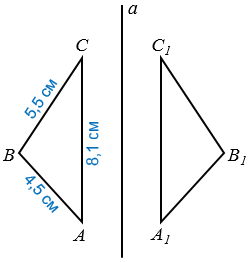 1. Точки А1, В1, С1 симметричны вершинам АВС относительно прямой , А1В1 = АВ = 4,5 см, В1С1 = ВС = 5,5 см, С1А1 = СА = 8,1 см.