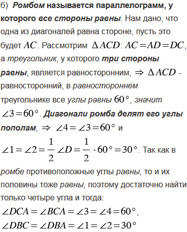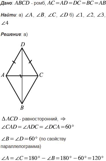 В ромбе одна из диагоналей равна стороне. Найдите: а) углы ромба; б) углы, которые диагонали образуют с его сторонами.
