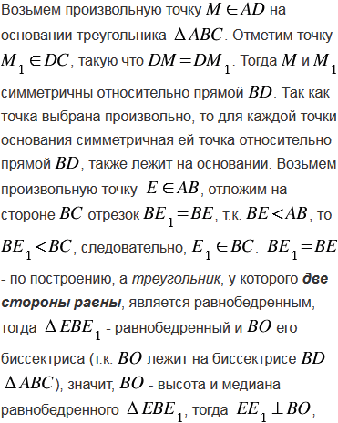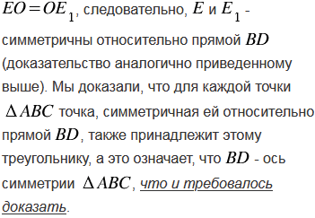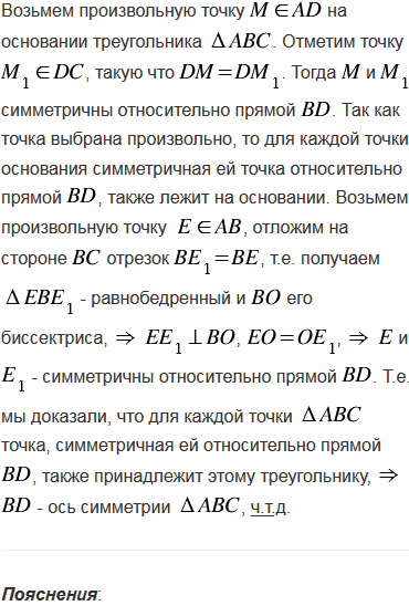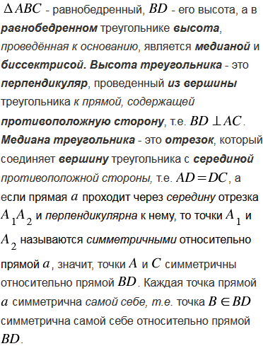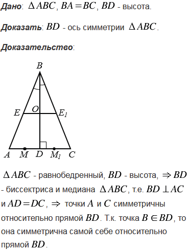 Докажите, что прямая, содержащая высоту равнобедренного треугольника, проведённую к основанию, является его осью симметрии.