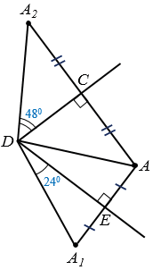 Точка А расположена во внутренней области угла CDE. Точка А1 симметрична точке А относительно прямой DE, и точка A2 симметрична точке А относительно прямой DC. Найдите угол CDE, если  А1DE = 24° A2DC = 48°.