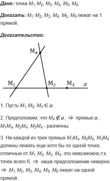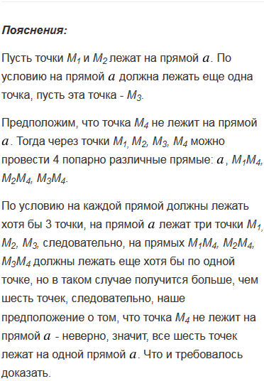 Даны шесть точек. Известно, что прямая через любые две точки, содержит по крайней мере еще одну из данных точек. Докажите, что все эти точки лежат на одной прямой.